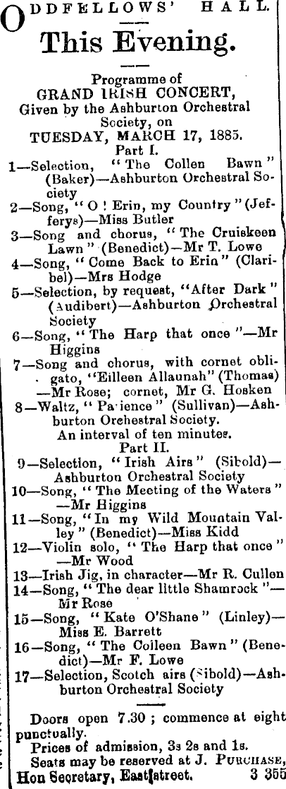 QDDFELLOWS’ hall. This Evening. Programme of GRAND IRISH CONCERT, Given by the Ashburton Orchestral Society, on TUESDAY, MARCH 17, 1885. ( Part I. 1— Selection, “ The Collen Bawn ” (Baker) —Ashburton Orchestral Society 2 Song, “O ! Erin, my Country (Jefferys)—Miss Butler 3 Song and chorus, “ The Cruiskeen Lawn ” (Benedict) —Mr T, Lowe 4 Song, “Come Back to Erin” (Olarihel)—Mrs Hodge 5 Selection, by request, “After Dark ” ( Audibert) —Ashburton Prcheatral Society 6 Song, “ The Harp that once ” —Mr Higgins 7 Song and chorus, with cornet obli- . gato, “Eilleen Allaunah” (Thomas) —Mr Rose; cornet, Mr G. Hosken 8— Waltz, “Pa ience ” (Sullivan) —Ashburton Orchestral Society. An interval of ten minutes. Part 11. 9 Selection, “Irish Airs” (Sibold)— Ashburton Orchestral Society 10 — Song, “ The Meeting of the Waters ” —Mr Biggins 11 — Song, “In my Wild Mountain Valley ” (Benedict) —Miss Kidd 12— Violin solo, “ The Harp that once " —Mr Wood i 13 —Irish Jig, in character—Mr R. Cullen 14—Song, “ The dear little Shamrock ’’ — Mr Rose ■ 15—Song, “ Kate O’Shane ” (Linley)— ; Miss E. Barrett 1 16—Song, “The Colleen Bawn”(Benei diet) —Mr P. Lowe | 17—Selection, Scotch airs (>ibold) —Ashburton Orchestral Society | Doors open 7.30; commence at eight t punctually- ; Prices of admission, 3s 2s and la. e Seats may be reserved at J. Puuciiase, Hon Segretary, Eaatjstteet. 3 355