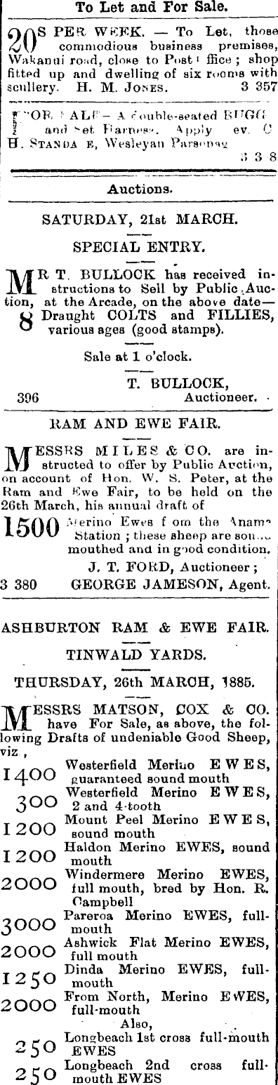 To Let and For Sale. QAS PER WRFK. To Let, those (C\f commodious business premises, Wakanui ro>id, close to Post' ffice ; shop fitted up and dwelling of six rooms with scullery. H. M. Jokes. 3 357 T"‘ - OF. ' ALT A rouble-seated BCGG I and s et Damns;*. 4pply ev. 0 H. Stanoa E, Wesleyan Parscnsg 3 3 8 Auctions. SATURDAY, 21st MARCH. SPECIAL ENTRY. MR T. BULLOCK has received instructions to Sell by Public ..Auction, at the Arcade, on the above date— Draught COLTS and FILLIES, O various ages (good stamps). Sale at 1 o’clock. T. BULLOCK, 396 Auctioneer. • RAM AND EWE FAIR. MESSRS MILES & CO. are instructed to offer by Public Auction, on account of Hon. W. S. Peter, at the Ram and Kwe Fair, to be held on the 26th March, his annual draft of 1 A‘ er * no f orn the \nam° Station ; these sheep are mouthed and in good condition, J, T. FORD, Auctioneer; 3 380 GEORGE JAMESON, Agent. ASHBURTON RAM & EWE FAIR. TINWALD YARDS. THURSDAY, 26th MARCH, 1885. Messrs matson, cox & 00. have For Sale, as above, the following Drafts of undeniable Good Sheep, viz , T Ann Westerfield Merino EWES, 1 guaranteed sound mouth _ Westerfield Merino EWES, T ooa Mount Peel Merino EWES, I sound mouth t Haldon Merino EWES, sound I 200 mouth ___ _ Windermere Merino EWES, 2000 full mouth, bred by Hon. R. Campbell Pareroa Merino EWES, full--3000 mouth _ Ashwick Flat Merino EWES, 2000 full mouth 0 r Dinda Merino EWES, fullFrom North, Merino EWES, 2000 full-mouth Also, _ - _ Longbeach Ist cross full-mouth 250 EWES 0 _ Longbeach 2nd cross full--250 mouth EWES