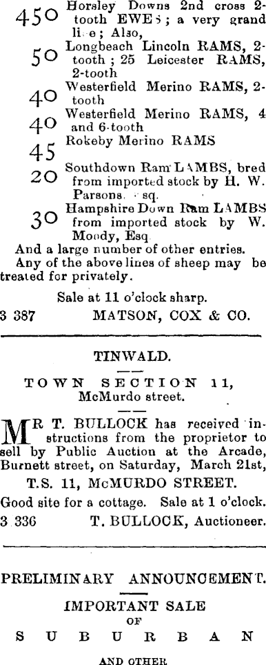 450 5o 40 40 45 Horsley Downs 2nd cross 2tooth EWE ■>; a very grand IT e; Also, Longbeach Lincoln RAMS, 2tooth ; 25 Leicester RAMS, 2-tooth Westerfield Merino RAMS, 2tooth Westerfield Merino RAMS, 4 and 6-tooth Rokeby Merino RAMS _ _ Southdown Ram"L\MBS, bred from imported stock by H. W. Parsons. • sq. _ _ Hampshire Do wn Rum LAMBS 3'“' from imported stock by W. Moody, Esq And a large number of other entries. Any of the above lines of sheep may be treated for privately. Sale at 11 o’clock sharp. 3 387 MATSON, COX & CO. TINWALD. TOWN SECTION 11, McMurdo street. MR T. BULLOCK has received instructions from the proprietor to sell by Public Auction at the Arcade, Burnett street, on Saturday, March 21st, T.S. 11, McMDRDO STREET. Good site for a cottage. Sale at 1 o’clock. 3 336 T. BULLOCK, Auctioneer. PRELIMINARY ANNOUNCEMENT. IMPORTANT SALE OF SUBURBAN AND OTHER
