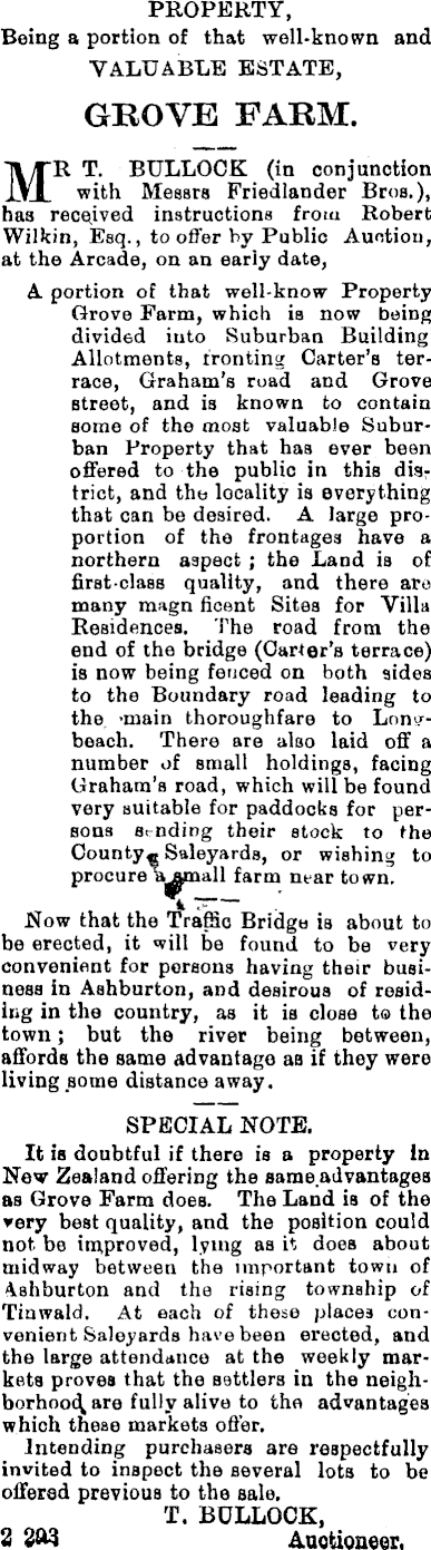 PROPERTY, Being a portion of that well-known and VALUABLE ESTATE, GBOYE FARM. MR T. BULLOCK (in conjunction with Messrs Friedlander Bros.), has received instructions from Robert Wilkin, Esq., to offer by Public Auction, at the Arcade, on an early date, A portion of that well-know Property Grove Farm, which is now being divided into Suburban Building Allotments, fronting Carter’s terrace, Graham’s road and Grove street, and is known to contain some of the most valuable Suburban Property that has ever been offered to the public in this distinct, and the locality is everything that can be desired. A large proportion of the frontages have a northern aspect; the Land is of first-class quality, and there are many magn ficent Sites for Villa Residences. The road from the end of the bridge (Carter’s terrace) is now being fenced on both sides to the Boundary road leading to the -main thoroughfare to beach. There are also laid off a number of small holdings, facing Graham’s road, which will be found very suitable for paddocks for persons sending their stock to the County« Saleyards, or wishing to procure agnail farm near town. Now that the Traffic Bridge is about to be erected, it will be found to be very convenient for persons having their business in Ashburton, and desirous of residing in the country, as it is close to the town; but the river being between, affords the same advantage as if they were living some distance away. SPECIAL NOTE. It is doubtful if there is a property In New Zealand offering the same advantages as Grove Farm does. The Land is of the very best quality, and the position could not be improved, lying as it does about midway between the important town of Ashburton and the rising township of Tinwald. At each of these places convenient Saleyards have been erected, and the large attendance at the weekly markets proves that the settlers in the neighborhood are fully alive to the advantages which these markets offer. Intending purchasers are respectfully invited to inspect the several lots to be offered previous to the sale, T. BULLOCK, 2 3&3 Auctioneer,