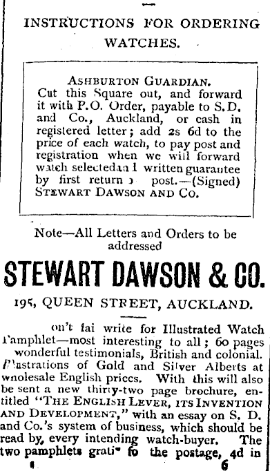 INSTRUCTIONS FOR ORDERING WATCHES. Ashburton Guardian. Cut this Square out, and forward it with P.O. Order, payable to S.D, and Co., Auckland, or cash in registered letter; add 2s 6d to the price of each watch, to pay post and registration when we will forward watch select edaa 1 written guarantee by first return a post.—(Signed) Stewart Dawson and Co. Note—All Letters and Orders to be addressed ! STEWART DAWSON & CO. 19*, QUEEN STREET, AUCKLAND. on’t fai write for Illustrated Watch Pamphlet— most interesting to all ; 60 pages wonderful testimonials, British and colonial, frustrations of Gold and Silver Alberts at wnolesale English prices. With this will also be sent a new thiny-two page brochure, entitled “The English Lever, its Invention and Development,” with an essay on S. D. and Co.’s system of business, which should be read by, every intending watch-buyer. The two pamphlets grati* fo the postage, 4d in • 6