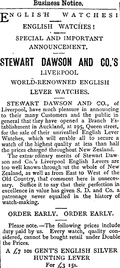 Business Notice. jgN GLISH WATCHESI englisiT'watches 1 SPECIAL AND IMPORTANT ANNOUNCEMENT. STEWART DAWSON AND GO.’S LIVERPOOL WORLD-RENOWNED ENGLISH LEVER WATCHES. STEWART DAWSON AND CO., of Liverpool, have much pleasure in announcing to their many Customers and the public in general that they have opened a Branch Establishment in Auckland, at 195, Queen street, for the sale of their unrivalled English Lever Watches, which will enable all to secure a watch of the highest quality at less than half the prices charged throughout New Zealand. The extraordinary merits of Stewart Dawson and Co.’s Liverpool English Levers are too well known through rut the whole of New Zealand, as well as from East to West of the Old Country, that comment here is unnecessary. Suffice it to say that their perfection in excellence in value has given S. D. and Co. a patronage never equalled in the history of watch-making. ORDER EARLY. ORDER EARLY. Please note.—The following prices include duty paid by us. Every watch, quality considered, cannot be bought retail under Double the Prices. A £7 10s GENT’S ENGLISH SILVER HUNTING LEVER For £3 15s.