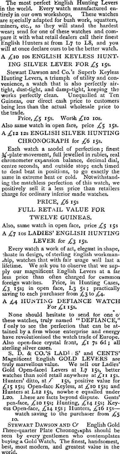 The most perfect English Hunting Levers in the world. Every watch manufactured entirely in our own workshops, These watches are specially adapted for bush work, squatters, miners, etc., as they will stand the hardest wear; send for one of these watches and compare it with what retail dealers call their finest English Hunters at from L 7 to LB, and you will at once declare ours to be the better watch. A £lO los ENGLISH KEYLESS HUNTING SILVER LEVER FOR .£5 15s. Stewart Dawson and Co.’s Superb Keyless Hunting Levers, a triumph of utility and convenience, a watch that is also perfectly airtight, dust-tight, and damp-tight, keeping the works perfectly clean. Unequalled at Ten Guineas, our direct cash price to customers being less than the actual wholesale price to the trade. Price, £$ 15s. Worth 10s. Also same watch in open face, price £$ 15s. A £l2 12s ENGLISH SILVER HUNTING CHRONOGRAPH for £6 15s. I Each watch a model of perfection; finest yi -plate- movement, full jewelled in rubies, real chronometer expansion balance, decimal dial, centre seconds, and outside stop; each timed to dead beat in positions, to go exactly the same in extreme heat or cold. Notwithstanding the matchless perfection of this watch, we positively sell it a less price than retailers charge for ordinary inferior made watches. PRICE, £6 15s FULL RETAIL VALUE FOR TWELVE GUINEAS. Also, same watch in open face, price £$ 15s A £7 ros LADIES’ ENGLISH HUNTING LEVER for £3 15s. Every watch a work of art, elegant in shape, '.haste in design, of sterling English workmanship, watches that with fair usage will last a lifetime. We ask you to observe that we supply our magnificent English Levers at a far less price than often charged for cemmon foreign watches. Price, in Hunting Cases, £3 15s; in open face, L 3 ss; practically saving to each purchaser from £3 to £4. A £4 HUNTING DEFIANCE WATCH For £i 15s. None should hesitate to send for one o ; these watches, truly named “DEFIANCE,” f only to see the perfection that can be attained by a firm whose enterprise and energy have revolutionised the watch trade of Europe. Also open-face crystal front, £1 7s fid; all sterling silver cases. S. D. & CO.’S LAD! ■ S’ and CENTS’ Magnificent English GOLD LEVERS are truly marvellous value. We sell our Ladies’ Gold Open-faced Levers at L 7 15s, better watches than sold retail anywhere atj£ii 15s. Hunters’ditto, at A 15s, positive value for £ls 15s; Open-face Keyless, at £lO 15s; and Hunters at Ll2 15s, nowhe e equalled under L2O. Lhese are facts beyond dispute. Gents’ pen-face, £lO 15s; Hunting, £l4 15s; Keyess Open-face, £l4 15s; Hunters, £l6 15s — watch saving to the purchaser from £3 10. Stewart Dawson anp Cr English Gold Three-quarter Plate Chronographs should be seen by every gentlemen who contemplates buying a Gold Watch. The finest, handsomest, best, most modem, and greatest value in the world.