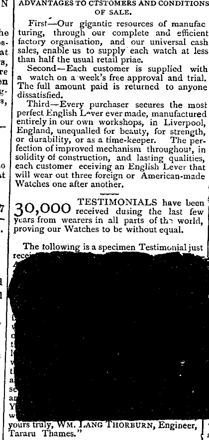 IN ADVANTAGES TO CTSTOMERS AND CONDITIONS OF SALE. he 3Sat rs, re an gts, bo sit First—Our gigantic resources of manufac taring, through our complete and efficient factory organisation, and our universal cash sales, enable us to supply' each watch at less than half the usual retail priae. Second—Each customer is supplied with a watch on a week’s free approval and trial. The full amount paid is returned to anyone dissatisfied. Third—Every purchaser secures the mosb perfect English L“ver ever made, manufactured entirely in our own workshops, in Liverpool, England, unequalled for beauty, for strength, or durability, or as a time-keeper. The perfection of improved mechanism throughout, in solidity of construction, and las! ing qualities, each customer eceiving an English Lever that will wear out three foreign or American-made Watches one after another. 2 TESTIMONIALS have been JO,UUU received dusing the last few years from wearers in all parts of tin world, proving our Watches to be without equal. The following is a specimen Testimonial just rec yours truly, Wm. Lang Thorburn, Engineer, Tararu Thames.”