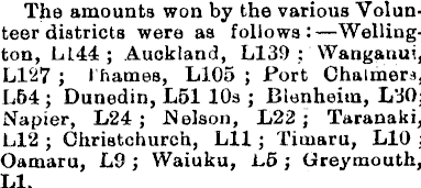 The amounts won by the various Volunteer districts were as follows:—Wellington, L 144 ; Auckland, L 139 ; Wanganui, L 127 ; Thames, LlO5 ; Port Chalmers, L 6 4; Dunedin, Lsl 10s ; Blenheim, L3O; Napier, L 2 4; Nelson, L 2 2; Taranaki, Ll2 ; Christchurch, Lll; Timaru, LlO ; Oamaru, L 9 ; Waiuku, L 5 ; Greymouth, LI.