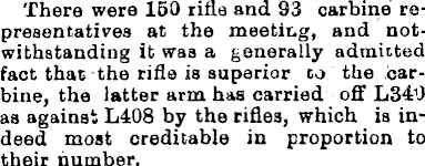 Thera were 150 rifle and 93 carbine representatives at the meeting, and notwithstanding It was a generally admitted fact that the rifle is superior to the carbine, the latter arm has carried off L 340 as against L4OB by the rifles, which is indeed most creditable in proportion to their number.