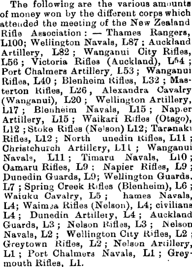 The following are the various amounts of money won by the different corps which attended the meeting of the New Zealand Rifle Association : Thames Rangers, L 100; Wellington Navals, LB7 : Auckland Artillery, LB2 ; Wanganui City Rifles, L 56 ; Victoria Rifles (Auckland), Lf>4 ; Port Chalmers Artillery, L 5 3; Wanganui Rifles, L4O ; Blenheim Rifles, L 32 ; Maaterton Rifles, L 2 6, Alexandra Cavalry (Wanganui), L2O ; Wellington Artillery, Ll 7 ; Blenheim Navals, Ll 5 ; Nap.er Artillery, Ll 5 ; Waikari Rifles (Otago), Ll2 ; Stoke Rifles (Nelson) Ll2; Taranaki Rifles, Ll2 ; North unedin Rifles, Lll ; Christchurch Artillery, LI I ; Wanganui Navals, Lll ; Timaru Navals, LlO; Oamaru Rifles, L 9 ; Napier Rifles, L 9 ; Punedin Guards, L 9; Wellington Guards, L 7 ; Spring Creek Rifles (Blenheim), L 6 ; Waiuku Cavalry, L 5 ; hames Navals, L 4; Waimea Rifles (Nelson), L 4; civilians L 4; Dunedin Artiilety, L 4 ; Auckland Guards, L 3 ; Nelson Rifles, L 3 ; Nelson Navals, L2 ; Wellington City Rifles, L2 ; Greytown Rifles, L2 ; Nelson Artillery, LI ; Port Chalmers Navals, Li ; Greymouth Rifles, LI.