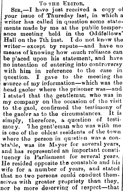 To the Editor, Sib, —I have just received a copy of your issue of Thursday last, in which a writer has called in question some statements made by me at the public temperance meeting held in the Oddfellows’ Hall on the 7th inst. Ido not know the writer—except by repute—and have no means of knowing how much reliance can be p’aced upon his statement, and have no intention of entering into controversy with him in reference to the case in question. I gave to the meeting the source of my information —which was the head gaoler where the prisoner was—and I stated that the gentleman who was in roy company on \he occasion of the visit to the gaol, confirmed the testimony of the gaoler as to the circumstances. It is simply, therefore, a question of testimony. Ihe gentleman who was with me is one of the oldest residents of the town where the person in question was a constable, was its Mayor for several years, and has represented an important constifuency in Parliament for several years. He resided opposite the constable and his wife for a number of years, and stated that no two persons could conduct thetnseives with greater propriety than they, nor be more deserving of respect—that