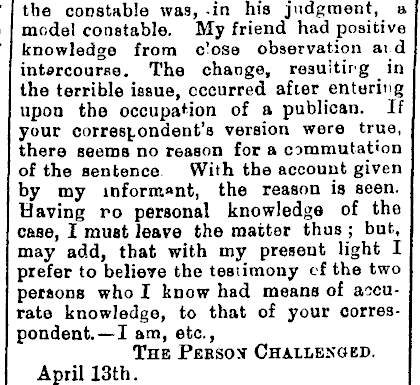 the constable was, -in his judgment, a model constable. My friend had positive knowledge from c’ose observation at d intercourse. The change, resulting in the terrible issue, occurred after entering upon the occupation of a publican. If your correspondent’s version were true, there seems no reason for a commutation of the sentence. With the account given by my informant, the reason is seen. Having ro personal knowledge of the case, 1 must leave the matter thus ; but, may add, that with my present light I prefer to believe the testimony ef the two persons who I know had means of accurate knowledge, to that of your correspondent.—l am, etc., The Person Challenged. | April 13th.