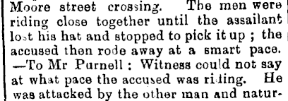 Moore street crossing. The men were riding close together until the assailant loat hia hat and stopped to pick it up ; the accused then rode away at a smart pace. —To Mr Purnell: Witness could not say at what pace the accused was ti ling. He was attacked by the other man and natur-