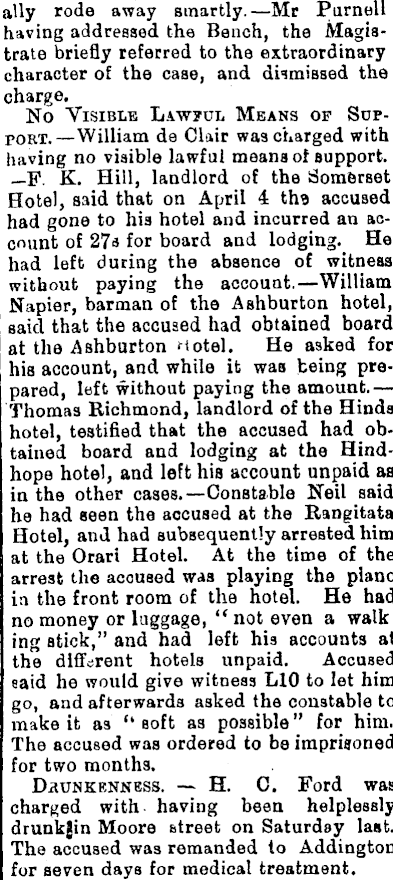 ally rode away smartly.—Mr Parnell having addressed the Bench, the Magistrate briefly referred to the extraordinary character of the case, and dismissed the charge. No Visible Lawful Means of Soppoet. —William de Clair was charged with having no visible lawful means of support. —P. K. Hill, landlord of the Somerset Hotel, said that on April 4 the accused had gone to his hotel and incurred an account of 27s for board and lodging. He had left during the absence of witness without paying the account.—William Napier, barman of the Ashburton hotel, said that the accused had obtained board at the Ashburton Hotel. He asked for his account, and while it was being prepared, left without paying the amount.— Thomas Richmond, landlord of the Hinds hotel, testified that the accused had obtained board and lodging at the Hindhope hotel, and left his account unpaid as in the other cases.—Constable Neil said he had seen the accused at the Rangitata Hotel, and had subsequently arrested him at the Orari Hotel. At the time of the arrest the accused was playing the piano in the front room of the hotel. He had no money or luggage, “ not even a walk ing stick,” and had left his accounts at the different hotels unpaid. Accused said he would give witness LlO to let him go, and afterwards asked the constable to make it as “ soft as possible ” for him. The accused was ordered to be imprisoned for two months. Drunkenness. H. 0. Ford was charged with having been helplessly drunkjin Moore street on Saturday last. The accused was remanded to Addington for seven days for medical treatment.
