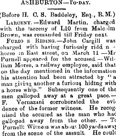 ASHBURTON— To-day. (Before H. 0. 8. Baddeley, Esq., R.M.) LiRGENY. —Edward Martin, charged with the larceny of LlO from Malcolm Brown, was remanded till Friday next. Furio s Riding. —John Cargill was charged with having furiously ridd n * horse in East street, on March II —Mr Purnell appeared for the accused.—William Morse, a railway employee, said that on the day mentioned in the information his attention had been attracted by “ a man giving another a furious hiding with a horse whip.” Subsequently one of the men galloped away at a great pace.— F. Vernazani corroborated the evidence of the former witness. He recognised the accused as the man who had galloped away from the other. To Purnell: Witness was about lOOyardsaway from the scene of the assault. He could