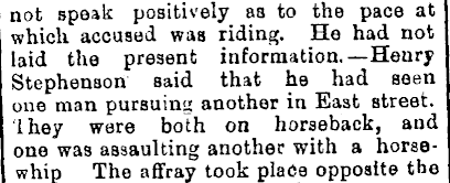 not speak positively as to the pace at which accused was riding. He had not laid the present information.—Henry Stephenson said that he had seen one man pursuing another in East street, 'they were both on horseback, and one was assaulting another with a horsewhip The affray took place opposite the