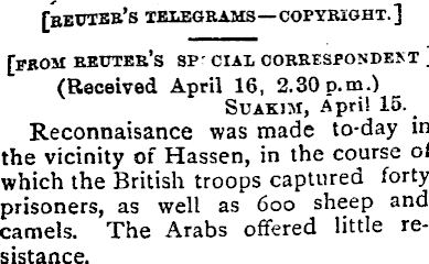 [becxbb’s telegrams—copyright. ] [FROM REUTER’S SP' cial correspondent ] (Received April 16, 2.30 p.m.) Suakim, April 15. Reconnaisance was made to-day in the vicinity of Hassen, in the course of which the British troops captured forty prisoners, as well as 600 sheep and camels. The Arabs offered little resistance.