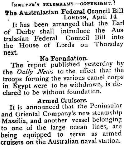 Fhrdtcr’s tblbsbams —ooftsisht.! The Australasian Federal Council Bill. London, April 14. It has been arranged that the Earl of Derby shall introduce the Australasian Federal Council Bill into the House of Lords on Thursday next No Foundation. The report published yesterday by the Daily News to the effect that the troops forming the various camel corps in Egypt were to be withdrawn, is declared to be without foundation. Armed Cruisers. It is announced that the Peninsular and Oriental Company’s new steamship Massilia, and another vessel belonging to one of the large ocean lines, are being equipped to serve as armed cruisers on the Australian naval station.