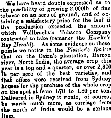 We have heard doubts expressed as to the possibility of growing 2,0001 b of fine tobacco on an acre of ground, and of obtaining a satisfactory price for the leaf if the production exceeded the amount which Vollbracht'a Tobacco Company contracted to take (remark? the Hawke’s Bay Herald). As some evidence on these points we notice in the Planter’s Mem to that on the Cairn’s plantation, Barron riyer, North India, the average crop this ?'ear is a top and a quarter, or ever 2,800 b pet acre of the best varieties, and that offers were received from Sydney houses for the purchase of the whole crop on the spot at from L7O to LBO per ton. Delivered in Sydney it would, of course, be worth much more, os carriage from the north of India would be a serious Item.