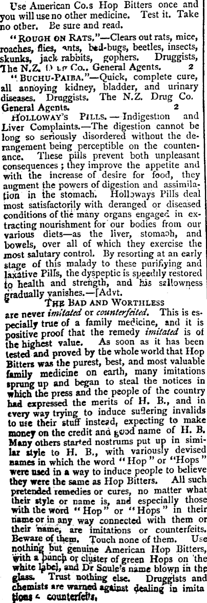 Use American Co.s Hop Bitters once and you will use no other medicine. Test it. Take no other. Be sure and read. “ Rough on Rats,”—Clears out rats, mice, roaches, flies, -wits, bed-bugs, beetles, insects, skunks, jack rabbits, gophers. Druggists, The N.Z. O up Co.. General Agents. 2 “ BucHU-Paiba.” —Quick, complete cure, all annoying kidney, bladder, and urinary diseases. Druggists. The N.Z. Drug Co. General Agents. 2 Holloway’s Pills. —lndigestion and Liver Complaints.—The digestion cannot be long so seriously disordered without the derangement being perceptible on the countenance. These pills prevent both unpleasant consequences ; they improve the appetite and with the increase of desire for food, they augment the powers of digestion and assimilation in the stomach. Holloway's Pills deal most satisfactorily with deranged or diseased conditions of tlie many organs engaged in extracting nourishment for our bodies from our various diets—as the liver, stomaoh, and bowels, over all of which they exercise the most salutary control. By resorting at an early stage of this malady to these purifiying and laxative Pills, the dyspeptic is speedily restored ip health and strength, and his ssllowness gradually vanishes.—f Advt. * I’HP Bap and Worthless are never imitated or counterfeited. This is especially true of a family medicine, and it is positive proof that the remedy imitated is of the highest value. As soon as it has been tested and proved by the whole world that Hop Bitters was the purest, best, and most valuable family medicine on earth, many imitations sprung up and began to steal the notices in which the press and the people of the country expressed the merits of H, 8., and in every way trying to induce sudenng invalids to use their stuff instead, expecting to make money on the credit and good name of H. B. Many others started nostrums put up in similar style to H. 8., with variously devised names in which the word “ Hop ” or “Hops ” were used in a way to induce people to believe they were the same as Hop Bitters. All such pretended remedies or cures, no matter what their style or name is, and especially those with the word "Hop” or “Hops” in their name or in any way connected with them or their 'name, sire imitations or counterfeits. Beware of.them. Touch none of them. Use nothing but genuine American Hop Bitters, With a pundi or cluster of green Hops on the white IpbeJ, and Dr Soule’s name blown in the glass. Trust nothing else. Druggists and chemists are wanted ageinst pealing in imita counterfeits.