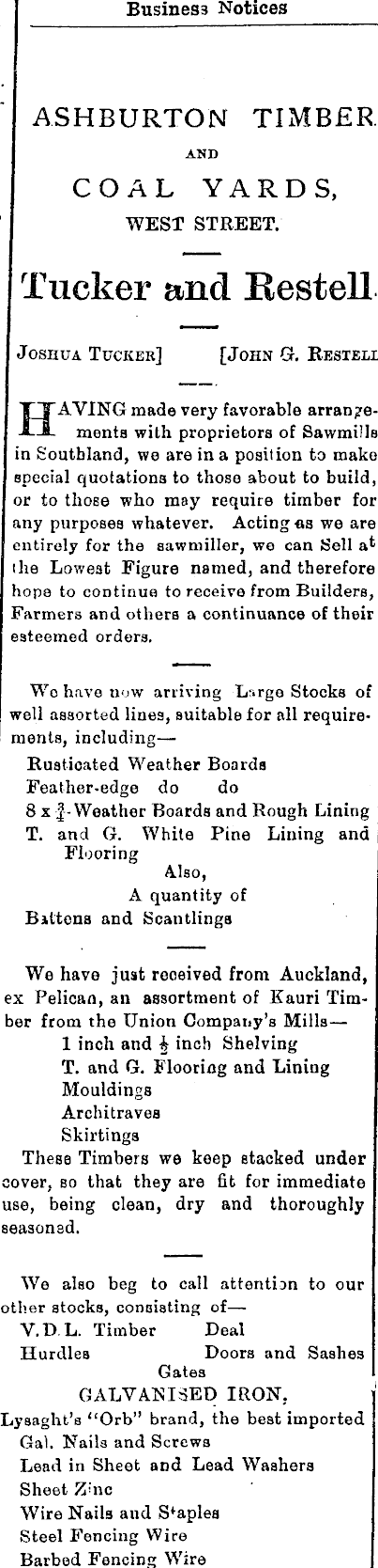 Business Notices ASHBURTON TIMBER AND COAL YARDS, WEST STREET. Tucker and Kestell Joshua Tucker] [John G, Restell HAVING made very favorable arrangements with proprietors of Sawmills in Southland, we are in a position to make special quotations to those about to build, or to those who may require timber for any purposes whatever. Acting «s we are entirely for the sawmiller, wo can Sell a* the Lowest Figure named, and therefore hope to continue to receive from Builders, Farmers and others a continuance of their esteemed orders. Wo have now arriving Lr.rga Stocks of well assorted lines, suitable for all requirements, including— Rusticated Weather Boards Feather-edge do do 8 x |-Weather Boards and Rough Lining T. and G. White Pine Lining and Flooring Also, A quantity of Battens and Scantlings We have just received from Auckland, ex Pelican, an assortment of Kauri Timber from the Union Company’s Mills—--1 inch and £ inch Shelving T. and G. Flooring and Lining Mouldings Architraves Skirtings These Timbers we keep stacked under cover, so that they are fit for immediate use, being clean, dry and thoroughly seasoned. We also beg to call attention to our other stocks, consisting of— V.D. L. Timber Deal Hurdles Doors and Sashes Gates GALVANISED IRON. Lysaght’s “Orb” brand, the best imported Gal. Nails and Screws Lead in Sheet and Lead Washers Sheet Z''nc Wire Nails and Staples Steel Fencing Wire Barbed Fencing Wire