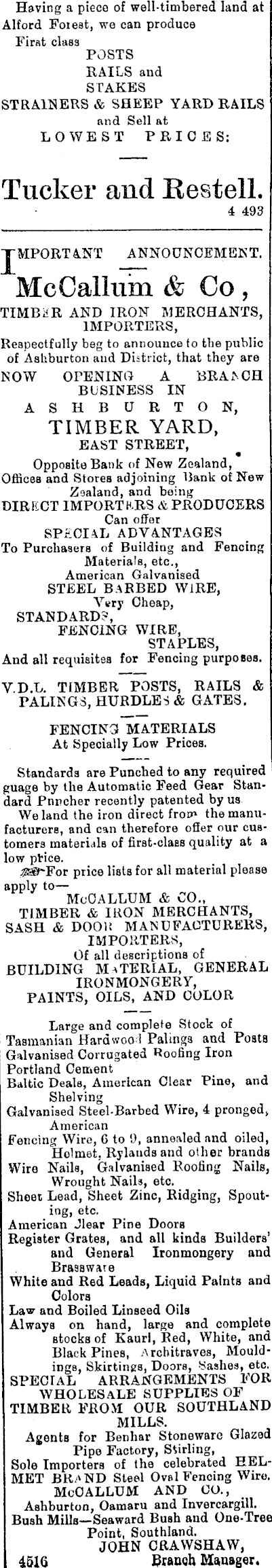 Having a piece of well-timbered land at Alford Forest, we can produce First class POSTS RAILS and STAKES STRAINERS & SHEEP YARD RAILS and Sell at LOWEST PRICES; Tucker and Eestell. 4 493 JMPORTANT ANNOUNCEMENT. McOalluin & Co, TIMBER AND IRON MERCHANTS, IMPORTERS, Respectfully beg to announce to the public of Ashburton and District, that they are NOW OPENING A BRANCH BUSINESS IN ASHBURTON, TIMBER YARD, EAST STREET, Opposite Bank of New Zealand, Offices and Stores adjoining Bank of New Zealand, and being DIRECT IMPORTERS & PRODUCERS Can offer SPECIAL ADVANTAGES To Purchasers of Building and Fencing Materials, etc., American Galvanised STEEL BARBED WIRE, Very Cheap, STANDARD?, FENCING WIRE, STAPLES, And all requisites for Fencing purposes. V.D.L. TIMBER POSTS, RAILS & PALINGS, HURDLES & GATES. FENCING MATERIALS At Specially Low Prices. Standards are Punched to any required guage by the Automatic Feed Gear Standard Pnncher recently patented by us We land the iron direct from the manufacturers, and can therefore offer our customers materials of first-class quality at a low ptice. price lists for all material please apply to — MoOALLUM & CO., TIMBER & IRON MERCHANTS, SASH & DOOR MANUFACTURERS, IMPORTERS, Of all descriptions of building material, general , IRONMONGERY, PAINTS, OILS, AND COLOR Large and complete Stock of Tasmanian Hardwood Palings and Posts Galvanised Corrugated Roofing Iron Portland Cement Baltic Deals, American Clear Pine, and Shelving Galvanised Steel-Barbed Wire, 4 pronged, American Fencing Wire, 6 to 9, annealed and oiled, Helmet, Rylaudsand other brands Wire Nails, Galvanised Roofing Nails, Wrought Nails, etc. Sheet Lead, Sheet Zinc, Ridging, Spouting, etc. American Jlear Pine Doors Register Grates, and all kinds Builders’ and General Ironmongery and Brassware White and Red Leads, Liquid Paints and Colors Law and Boiled Linseed Oils Always on hand, large and complete stocks of Kauri, Red, White, and Black Pines, Architraves, Mouldings, Skirtings, Doors, Sashes, etc. SPECIAL ARRANGEMENTS FOR WHOLESALE SUPPLIES OF TIMBER FROM OUR SOUTHLAND MILLS. Agents for Benhar Stoneware Glazed Pipe Factory, Stirling, Sole Importers of the celebrated HELMET BRAND Steel Oval Fencing Wire, McOALLUM AND CO., Ashburton, Oamaru and Invercargill. Bush Mills—Seaward Bush and One-Tree Point, Southland. JOHN ORAWSHAW, 4516 Branch Manager.