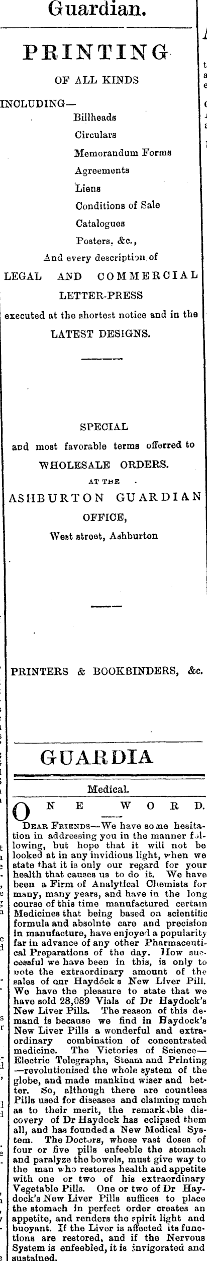 Guardian. PRINTING U OF ALL KINDS J INCLUDING— C Billheads a Circulars „ I Memorandum Forms Agreements Liens Conditions of Sale Catalogues Posters, &c., -And every description,of i i LEGAL AND COMMERCIAL i LETTER-PRESS i executed at the shortest notice and in the . LATEST DESIGNS. SPECIAL and most favorable terms offerred to WHOLESALE ORDERS. AT IBS ASHBURTON GUARDIAN OFFICE, West street, Ashburton f f ■ PRINTERS & BOOKBINDERS, &c. 1 t 5 I S l GDARDIA 1 - i Medical. a Q N E WORD. Dear Friends —We have so are hesitation in addressing you in the manner following, but hope that it will not be h looked at in any invidious light, when we e state that it is only our regard for your i- health that causes us to do it. We have 1, been a Firm of Analytical Chemists for « many, many years, and have in the long g course of this time manufactured certain n Medicines that being based on scientific formula and absolute care and precision In manufacture, have enjoyed a popularity far in advance of any other Pharmaceutical Preparations of the day. How successful we have been in this, is only to note the extraordinary amount of the ’* sales of onr Haydook s New Liver Pill. We have the pleasure to state that we have sold 28,089 Vials of Dr Haydock’s New Liver Pills. The reason of this des mand is because we find in Haydock’s tr New Liver Pills a wonderful and extraordinary combination of concentrated medicine. The Victories of Science— Electric Telegraphs, Steam and Printing —revolutionised the whole system of the ’ globe, and made mankind wiser and better. So, although there are countless j. Pills used for diseases and claiming much d as to their merit, the remarkable discovery of Dr Haydock has eclipsed them all, and has founded a New Medical System. The Doctors, whose vast doses of g four or five pills enfeeble the stomach and paralyze the bowels, must give way to the man who restores health and appetite with one or two of his extraordinary Vegetable Pills. One or two of Dr Hayn dock’s New Liver Pills suffices to place i, the stomach in perfect order creates an y appetite, and renders the spirit light and - buoyant. If the Liver is affected its fane- j tions are restored, and if the Nervous System is enfeebled, it is .invigorated and e sustained.