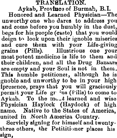 TRANSLATION. Aykab, Province of Burmah, 8.1. Honored and Learned Physician—The unworthy one who dares to address you and come before you humbly in the dust, begs for his people (caste) that you would deign to look upon their ignoble miseries and cure them with your Life-giving grains (Pills). Illustrious one your most potent medicine is life to them and their children, and all the Drug Bazaars are empty and your Soul is not in them. This humble petitioner, although he is gnoble and unworthy to be in your high Iprosence, prays that you will graciously permit your Life gr ; ns (Pills) to come to Aykab. To the rm._t learned and wise Physician Haylock (Haydock) of high name. Native to the States of America, united in North America Country, Serviely signing for himself and twentythree others, the Petitioner places his sign,