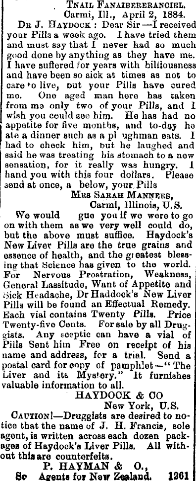 Tnaxi, Fanaibereeanciel. Carmi, 111., April 2, 1884. Dr J. Hatdock : Dear Sir —I received your Pills a week ago. I have tried them and must say that 1 never had so much good done by anything as they have me. I have suffered for years with billlousness and have been so sick at times as not to care *o live, out your Pills have cured mo. One aged man here has taken from me only two of your Pills, and I wish you ceuld see hirp. He has had no appetite for five months, and to-day he ate a dinner such as api ughman eats. 1 had to check him, but he laughed and said he was treating his stomach to a new sensation, for it really was hungry. I hand you with this four dollars. Please send at once, a below, your Pills Mrs Sabah Manners, Oarml, Illinois, U.S. Wo would gne you if we were to go on with them as we very well could do, but the above must suffice. Haydock’s New Liver Pills are the true grains and essence of health, and the gieatest blessing that Science has given to the world. For Nervous Prostration, Weakness, General Lassitude, Want of Appetite and Sick Headache, Dr Haddock’s New Liver Pills will be found an Effectual Bemedy. Each vial contains Twenty Pills. Price Twenty-five Cents. For sale by all Druggists. Any sceptic can have a vial of Pills Sent him Free on receipt of his name and address, for a trial. Send a postal card for copy of pamphlet— 1 * The Liver and its Mystery.” it furnishes valuable information to all. HAYDOOK & 00 New York, U.S. Cautionl —Druggists are desired to notice that the name of J. H. Francis, sole agent, is written across each dozen packages of Haydock’s Liver Pills. All without this are counterfeits. p. hayman & 0., Sc Agouti for New Zealand. 1261