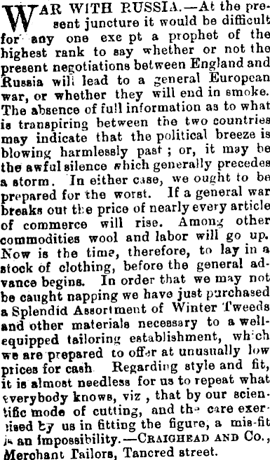 TTTAR WITH RUSSIA.—At the preYY sent juncture it would be difficult for’ Boy one exc pt a prophet of the highest rank to say whether or not the present negotiations between England and Russia will lead to a general European war, or whether they will end in smoke. The absence of full information as to what is transpiring between two countries may indicate that the political breeze is blowing harmlessly past ; or, it may be the awful silence which generally precedes a storm. In either case, we ought to be prepared for the worst. If a general war breaks out the price of nearly every article of commerce will rise. Among other commodities wool and labor will go up. Now is the time, therefore, to lay in a stock of clothing, before the general advance begins. In order that we may not be caught napping we have just purchased a Splendid Assortment of Winter Tweeds and other materials necessary to a wellequipped tailoring establishment, wh-ch wo are prepared to offar at unusually low prices for cash Regarding style and fit, it is almost needless for ns to repeat what everybody knows, viz , that by our scientific mode of catting, and th- care exerused by us in fitting the figure, a mis-fit j« an Impossibility. — Craighead and Co., Merchant, Tailors, Tancred street.