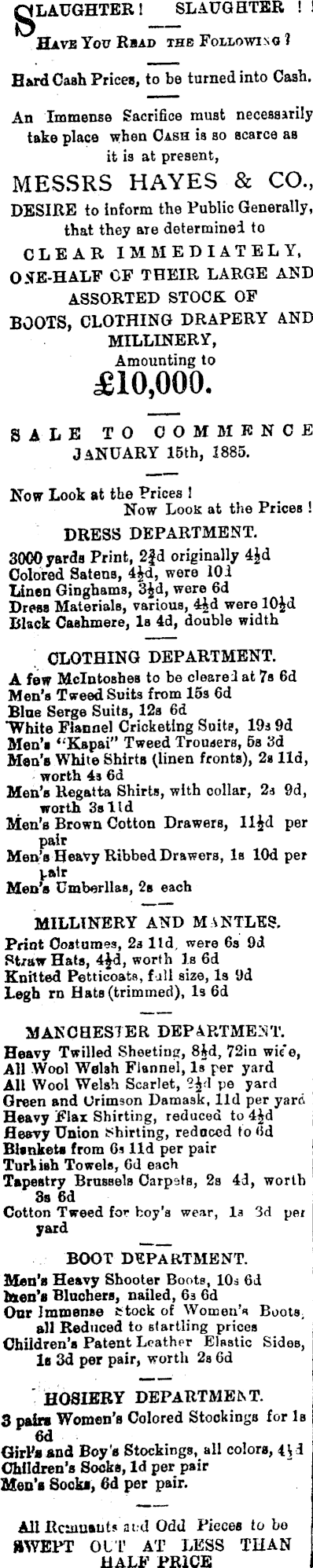 SLAUGHTER I SLAUGHTER ! ! Have Yon Rbad the Following ? Hard Cash Prices, to be turned into Cash, An Immense Sacrifice must necessarily take place when Cash is so scarce as it is at present, MESSRS HAYES & CO., DESIRE to inform the Public Generally, that they are determined to CLEAR IMMEDIATELY. ONE-HALF CF THEIR LARGE AND ASSORTED STOCK OF BOOTS, CLOTHING DRAPERY AND MILLINERY, Amounting to £IO,OOO. SALE TO COMMENCE JANUARY 15 th, 1885, Now Look at the Prices 1 Now Look at the Prices ! DRESS DEPARTMENT. 3000 yards Print, 2|d originally 4jd Colored Salens, 4£d, were 101 Linen Ginghams, 3sd, were 6d Dress Materials, various, 4£d were IOJd Black Cashmere, Is 4d, double width CLOTHING DEPARTMENT. A few Mclntoshes to be cleared at 7s 6d Men’s Tweed Suits from 15s 6d Blue Serge Suits, 12a 6d 1711116 Flannel Cricketing Suits, 19s 9d Men’s “Kapai” Tweed Trousers, 5s 3d Men’s White Shirts (linen fronts), 2s lid, worth 4s 6d Men’s Regatta Shirts, with collar, 2s 9d, worth 3slid Men’s Brown Cotton Drawers, ll£d per pair Men’s Heavy Ribbed Drawers, Is lOd per pair Men’s Umberllss, 2s each MILLINERY AND MANTLES, Print Costumes, 2a lid, were 6a 9d Straw Hals, 4£d, worth Is 6d Knitted Petticoats, full size, la 9d Legh rn Hats (trimmed). Is 6d MANCHESTER DEPARTMENT. Heavy Twilled Sheeting, B£d, 72in wk*e, All Wool Welsh Flannel, Is per yard All Wool Welsh Scarlet, 2s d pe yard Green and Crimson Damask, lid per yard Heavy Flax Shirting, reduced to 4Jd Heavy Union Shirting, reduced toOd Blankets from 6s lid per pair Turkish Towels, 6d each Tapestry Brussels Carpets, 2s 4d, worth 8s 6d Cotton Tweed for boy's wear, la 3d per yard BOOT DEPARTMENT. Men’s Heavy Shooter Boots, 10s 6d teen’s Bluchers, nailed, 6s 6d Our Immense stock of Women’s Boots ; all Reduced to startling prices Children’s Patent Leather Elastic Sides, Is 3d per pair, worth 2s 6d HOSIERY DEPARTMENT. 3 pairs Women’s Colored Stockings for Is 6d Girl’s and Boy's Stockings, all colors, 4sd Children’s Sooks, id per pair Men’s Sooks, 6d per pair. All Remnants and Odd Pieces to bo SWEPT OUT AT LESS THAN HALF PRICE