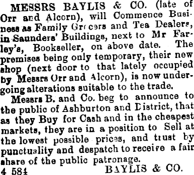 MESSRS BAYLIB <fe 00. (late of Orr and Alcorn), will Commence Business as Family Oncers and Tea Dealers, in Saunders’ Buildings, next to Mr tarlev’s, Bookseller, on above date. Ihe premises being only temporary, their new shop (next door to that lately occupied by Messrs Orr and Alcorn), is now undergoing alterations suitable to the trade. Messrs B. and Co. beg to announce to the public of Ashburton and District, that as they Boy for Cash and in the cheapest markets, they are in a position to Sell at the lowest possible prices, and tiust by punctuality and despatch to receive a fair share of the public patronage. 4 584 BAYLI3 & CO.