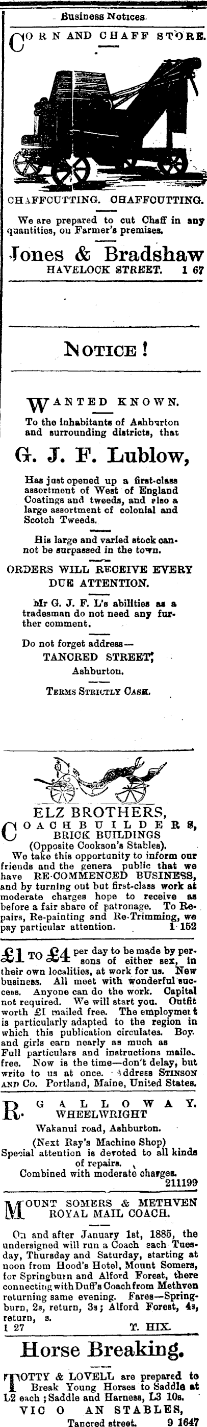 - Business Notices QO R N AND CHAFF STORE. CHAFFCUTTING. OHAFFOUTTING. We are prepared to cut Chaff in any quantities, ou Farmer’s premises. Tones & Bradshaw HAVELOCK STREET. 1 67 ANTED KNOWN. To the inhabitants of Ashburton and surrounding districts, that G. J. F. Lublow, Has just opened up a first-class assortment of West of England Coatings and tweeds, and elso a large assortment of colonial and Scotch Tweeds, His large and varied stock cannot be surpassed in the town. ORDERS WILL~RFOEIYE EVERY DUE ATTENTION. Mr G. J. F. L’s abilities as a tradesman do not need any further comment. Do not forget address— TANCRED STREET! Ashburton. Tebus Stbictly Cash. ELZ BROTHERS, COAOHBUILDERS, BRICK BUILDINGS (Opposite Cookson’s Stables), We take this opportunity to inform onr friends and the genera public that we have RE COMMENCED BUSINESS, and by turning out but first-class work at moderate charges hope to receive as before a fair share of patronage. To Repairs, Re-painting and Re-Trimming, we pay particular attention. 1-152 O I TO -CzL P er day to be made by pertheir own localities, at work for us. New business. All meet with Wonderful success. Anyone can do the work. Capital not required. We will start you. Outfit worth £1 mailed free. The employmet t is particularly adapted to the region in which this publication circulates. Boy. and girls earn nearly as much as Full particulars and instructions mails., free. Now is the time—don't delay, but write to us at once, address Stinson anp Co. Portland, Maine, United States. RG ALLOWAY. • WHEELWRIGHT Wakanui road, Ashburton. (Next Ray’s Machine Shop) Special attention is devoted to all kinds of repairs. v Combined with moderate charges. 211199 Mount somers & methven ROYAL MAIL COACH. On and after January Ist, 1885, the undersigned will run a Coach each Tuesday, Thursday and Saturday, starting at noon from Hood’s Hotel, Mount Somers, tor Springbutn and Alford Forest, there connecting with Duffs Coach from Methven returning same evening. Fares—Springburn, 2s, return, 3s j Alford Forest, 4s, return, s. I 27 T. HIX Horse Breaking, TOTTY & LOVELL are prepared to Break Young Horses to Saddle at L2 each ; Saddle and Harness, L 3 10s. VIO O AN STABLES, Tancred street. 9 1647