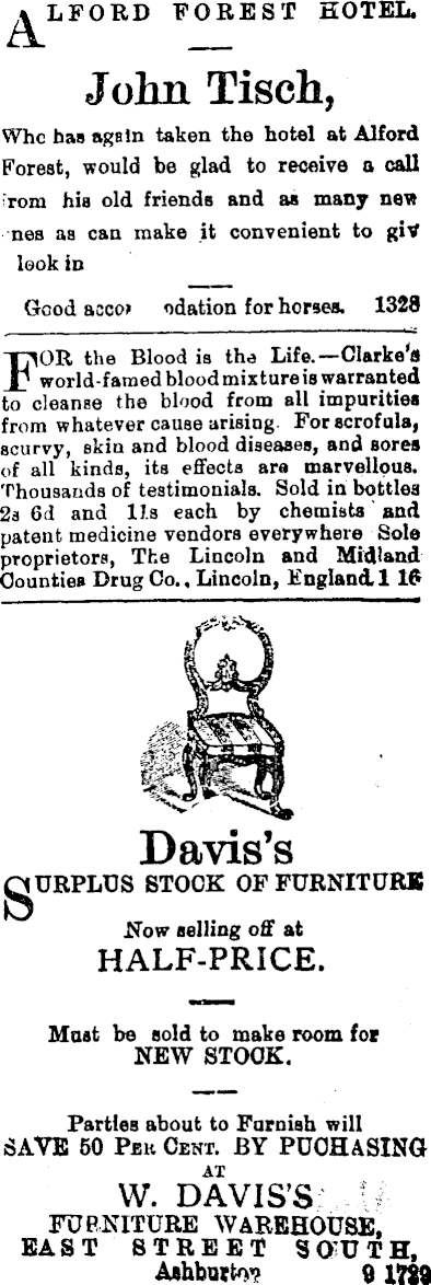LFORD FOREST HOTEL. Whc has again taken the hotel at Alford Forest, would be glad to receive a call 'rom hia old friends and as many new nes as can make it convenient to giV look in Good aoco> odation for horses. 1328 FOR the Blood is the Life.—Clarke's world-famed blood mixture is warranted to cleanse the blood from all impurities from whatever cause arising. For scrofula, scurvy, skin and blood diseases, and sores of all kinds, its effects are marvellous. Thousands of testimonials. Sold in bottles 2a 6d and 11s each by chemists' and patent medicine vendors everywhere Sole proprietors, The Lincoln and Midland Counties Drug Co., Lincoln, England. 118 gURPLUS STOCK OF FURNITURE Now selling off at HALF-PRICE. Mast be sold to make room tot NEW STOCK. Parties about to Furnish will SAVE 50 Pjsh Cent. BY PUOHASING W. DAVIS'S FURNITURE WAREHOUSE. EAST STREET SQIUTH, John Tisch, Davis’s Ashbatto’? oim
