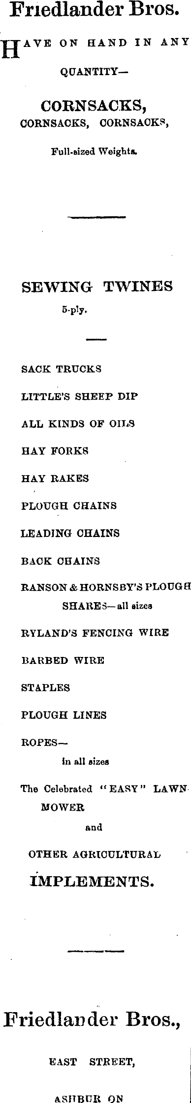 Fnedlander Bros. IJAVE ON HAND IN ANY QUANTITY—CORNSACKS, CORNSACKS, OORHSACKS, Full-sized Weights. SEWING TWINES 5-ply. SACK TRUCKS LITTLE’S SHEEP DIP ALL KINDS OF OILS HAY FORKS HAY RAKES PLOUGH CHAINS LEADING CHAINS BACK CHAINS RANSON & HORNSBY’S PLOUGH SHARES—aII sizes RYLAND’S FENCING WIRE BARBED WIRE STAPLES PLOUGH LINES ROPES—in all sizes The Celebrated “EASY” LAWN MOWER and OTHER AGRICULTURAL IMPLEMENTS. Friedlaoder Bros., EAST STREET, ASHBUB ON
