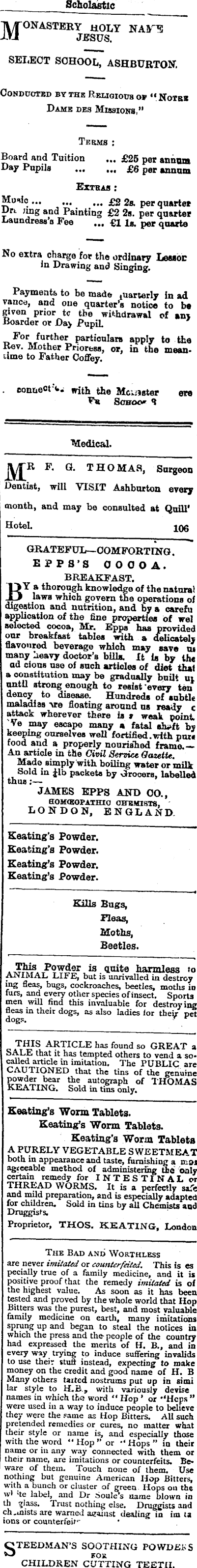Scholastic ■jl/TONASTERY HOLY NAITE -i-U JESUS. SELECT SCHOOL, ASHBURTON, Conducted by the Religious of “ Notes Dams des Missions,” Terms ; Board and Tuition ~, £25 per annum Day Pupils £6 per annum Extras : 2s. per quartet Dn. ;mg and Painting £2 2s. per quarter Laundress’s Fee ... £1 la. per quarts No extra charge for the ordinary Lessor In Drawing and Singing. Payments to be made quarterly in ad vance, and one quarter’s notice to be given prior tc the withdrawal of am Boarder or Da> Pupil _ Foe further particulars apply to the Rev. Mother Prioress, or, in the meantime to Father Coffey. connect with the Mcujster ere Fe Sohoo* 9 Medical. typ F. Q. THOMAS, Surgeon Dentist, will VISIT Ashburton every month, and may be consulted at Quill* Hotel. 106 GRATEFUL—COMFORTING. EPPS’S 000 OA. BREAKFAST. BY a thorough knowledge of the natural laws which govern the operations ol digestion and nutrition, and by a oarefu application of the fine properties of wel selected cocoa, Mr. Epps provided our breakfast tables with a delicately flavoured beverage which may save m many heavy doctor’s bills. It is by lh« ad cions use of such articles of diet that a constitution may be gradually built ui until strong enough to resist every ten dency to disease. Hundreds of subtle maladies ire floating around ns ready c attack wherever there Is r weak point, Ve may escape many a fatal ehioft by keeping ourselves well fortified.with pure food and a properly nourished frame.-' An article in the Civil Service Gazette. Made simply with boiling water or miiv Sold in Jib packets by Grocers, labelled thus;— JAMES EPPS AND 00., BOMtKOPAXIIXO CHEMISTS, ' LONDON, ENGLAND. Seating’s Powder. Keating’s Powder. Seating’s Powder. Seating’s Powder. Kills Bugs, Fleas, Moths, Beetles. .This Powder is quite harmless i ANIMAL LIFE, but is unrivalled in destroys fleas, bugs, cockroaches, beetles, moths i furs, and every other species ofinsect. Sport men will find this invaluable for destroy ii fleas in their dogs, as also ladies for they- p THIS ARTICLE has found so GREAT SALE that it has tempted others to vend a s called article in imitation. The PUBLIC a CAUTIONED that the tins of the genui P°£'f® r i*£ ar autograph of THOMi •K>Jt*AiING. Sold m tins only* Keating’s Worm Tablets. Keating’s Worm Tablets. Keating’s Worm Tablet A PURELY VEGETABLE SWEETMEA both in appearance and taste, famishing a ic agreeable method of administering the oi certain remedy for INTESTINAL THREAD WORMS. It is a perfectly s: and mild preparation, and is especially adapt for children. Sold in tins by all Chemists a Druggists, Proprietor, THOS. KEATING, Lend The Bad and Worthless are never imitated or counterfeited. This is es pecially true of a family medicine, and it is positive proof that the remedy imitated is of the highest value. As soon as it has been tested and proved by the whole world that Hop Bitters was the purest, best, and most valuable family medicine on earth, many imitations sprung up and began to steal the notices in which the press and the- people of the country had expressed the merits of H. 8., and in every way trying to induce suffering invalids to use their stuff instead, expecting to make money on the credit and good name of H. B Many others tailed nostrums put up in simi lar style to H,B, with variously devise names in which the word " Hop ’ or *‘Hcps ” were used in a way to induce people to believe they were the same as Hop Bitters. Alt such pretended remedies or cures, no matter what their style or name is, and especially those with the word “ Hop ”or Hops ”in their name or in any way connected with them or their name, are imitations or counterfeits. Beware of them. Touch none of them. Use nothing but genuine American Hop Bitters, with a bunch or cluster of green- Hops on the \y\ *tc label, and Dr Soule s name blown in th glass. Trust nothing else. Druggists and ch .mists are warned against dealing in im ta ions or counterfeit 1 " TEEDMAN’S SOOTHING POWDEKS 1 FOR CHILDREN CUTTING TEETH.
