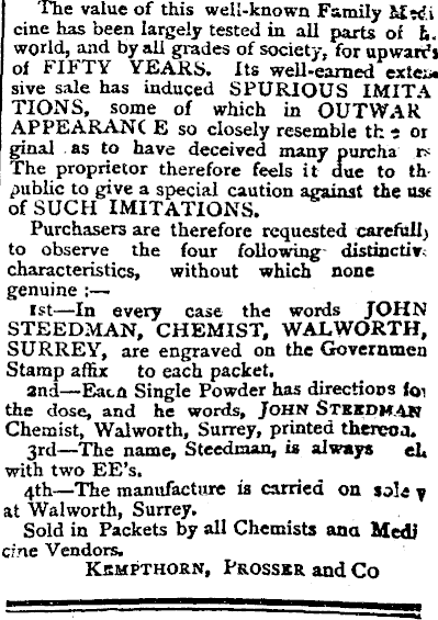 The value of this well-known Family Mti.i cine has been largely tested in all parts oi h. world, and by all grades of society, for upwards of FIFTY YEARS. Its well-earned extena sive sale has induced SPURIOUS IMITA TIONS, some of which in OUT WAR APPEARANC E so closely resemble th e or ginal as to have deceived many puicha rs The proprietor therefore feels it due to thpublic to give a special caution against the use of SUCH IMITATIONS. Purchasers are therefore requested careful!) to observe the four following- distinctly; characteristics, without which none genuine Ist —ln every case the words JOHN STEED-MAN, CHEMIST, WALWORTH, SURREY, are engraved on the Governmen Stamp affix to each packet, and—Each Single Powder has directions fo< the dose, and he words, JOHN StkkdhAß Chemist, Walworth, Surrey, printed thercoa. 3rd —The name, Steedman, is always eh with two EE’s. 4th —The manufacture is carried on sole y at Walworth, Surrey. Sold in Packets by all Chemists ana Medl cine Vendors. Kkmpthorn, Prosser and Co