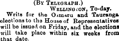 (By Telegraph.) Wellington, To-day. Writs for the Oomaru and Taaranga elections to the House of Representatives will be issued on Friday, and the elections will take place within six weeks from that date.