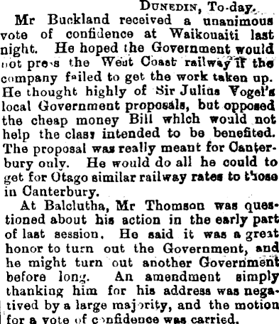 Dunedin, To-day.. Mr Buckland received a unanimous vote of confidence at Waikouaiti last night. He hoped the Government would not pro-a the Went Coast railway if the company failed to get the work taken np. He thought highly of Sir Julius Yogel’s local Government proposals, but opposed the cheap money Bill which would not help the clasi intended to be benefited. The proposal was really meant for Canterbury only. He would do all ha could to get for Otago similar railway rates to those in Canterbury. i At Balolufcha, Mr Thomson was questioned about his action in the early part of last session. He said it was a great honor to turn out the Government, and he might turn out another Goverdmehl before long. An amendment simply thanking him for his address was negaI lived by a large majority, and the motion ( for a vote of confidence wascarried.
