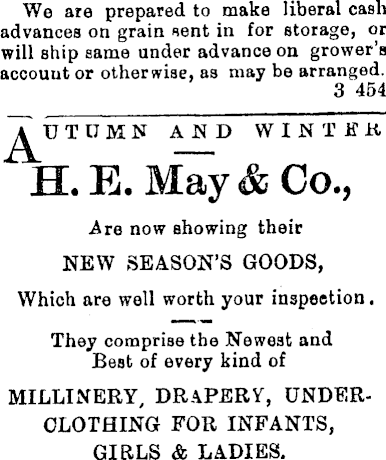 We are prepared to make liberal cash advances on grain sent in for storage, or will ship same under advance on grower’s account or otherwise, as may be arranged. UTDMN AND WINTER Are now showing their NEW SEASON’S GOODS, Which are well worth your inspection. They comprise the Newest and Best of every kind of MILLINERY, DRAPERY, UNDERCLOTHING FOR INFANTS, GIRLS & LADIES. 3 454 H. E. May & Co.,