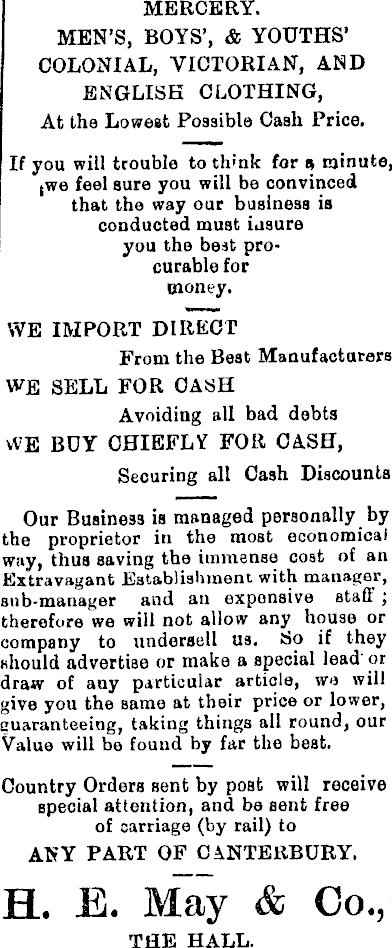 MERCERY. MEN’S, BOYS’, & YOUTHS’ COLONIAL, VICTORIAN, AND ENGLISH CLOTHING, At the Lowest Possible Cash Price. If you will trouble to th'nk for a minute, jwe feel sure you will be convinced that the way our business is conducted must insure you the best procurable for money. WE IMPORT DIRECT From the Beat Manufacturers WE SELL FOR CASH Avoiding all bad debts WE BUY CHIEFLY FOR CASH, Securing all Cash Discounts Our Business is managed personally by the proprietor in the most economical way, thus saving the immense cost of an Extravagant Establishment with manager, sub-manager and an expensive staff; therefore we will not allow any house or company to undersell us. So if they should advertise or make a special lead’ or draw of any particular article, we will give you the same at their price or lower, guaranteeing, taking things all round, our Value will be found by far the beat. Country Orders sent by post will receive special attention, and be sent free of carriage (by rail) to ANY PART OF CANTERBURY. H. E. May & Co., THE HALL.