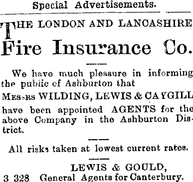 Special Advertisements. rpHE LONDON AND LANCASHIRE Fire Insurance Co. We have much pleasure in informing the public of Ashburton that Messrs WILDING, LEWIS & OA if GILL have been appointed AGENTS for the above Company in the Ashburton District. All risks taken at lowest current rates. LEWIS & GO OLD, 3 328 General Agents for Canterbury.
