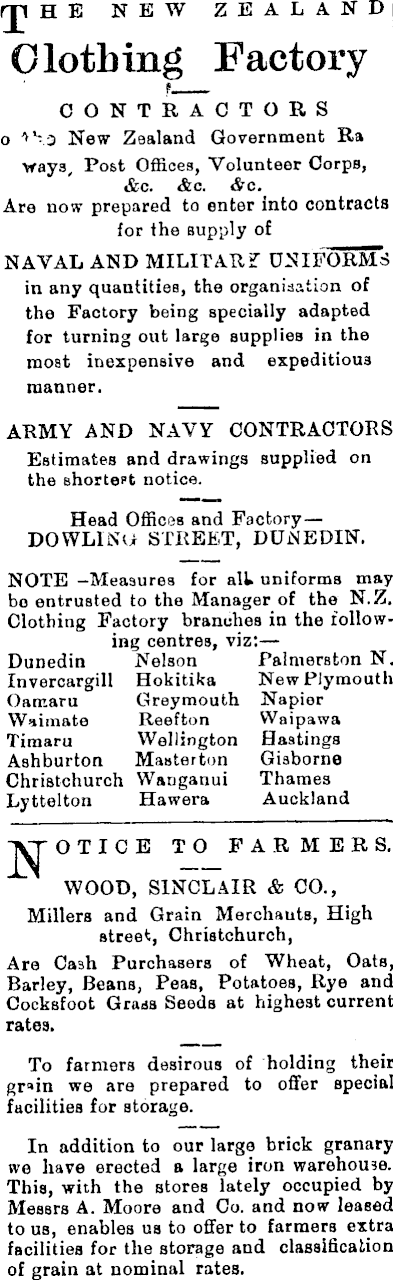 jIBE NEW ZEALAND Clothing Factory CONTRACTORS o New Zealand Government Ra ways. Post Offices, Volunteer Corps, etc. Ac. Ac. Are now prepared to enter into contracts for the supply of NAVAL AND MILITARY UNIFORMS in any quantities, the organisation of the Factory being specially adapted for turning out large supplies in the moat inexpensive and expeditious manner. ARMY AND NAVY CONTRACTORS Estimates and drawings supplied on the shortest notice. Head Offices and Factory— DOWLING STREET, DUNEDIN. NOTE -Measures for alt uniforms may bo entrusted to the Manager of the N.Z. Clothing Factory branches in the following centres, viz;— Dunedin Invercargill Oamaru Waimate Timaru Ashburton Nelson Hokitika Grey mouth Reefton Wellington Masterton Christchurch Wanganui Lyttelton Hawera Palmerston N, New Plymouth Napier Waipawa Hastings Gisborne Thames Auckland OTICE TO FARMERS. WOOD, SINCLAIR & CO., Millers and Grain Merchants, High street, Christchurch, Are Cash Purchasers of Wheat, Oats, Barley, Beans, Peas, Potatoes, Rye and Cocksfoot Grass Seeds at highest current rates. To farmers desirous of holding their gr»in we are prepared to offer special facilities for storage. In addition to our large brick granary we have erected a large iron warehouse. This, with the stores lately occupied by Messrs A. Moore and Co. and now leased to us, enables us to offer to farmers extra facilities for the storage and classification of grain at nominal rates.