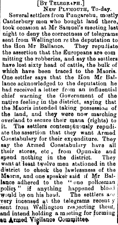 [By Tblegrsph.] New Plymouth, To-day. Several settlers from Pungarohu, mostly Canterbury men who bought laud there, took occasion at Mr Samuel's meeting last night to deny the correctness of telegrams sent from Wellington re the deputation to the Bon Mr Ballance. They repudiate the assertion that the Europeans are com mitting the robberies, and say the settlers hare lost sixty head of cattle, the bulk of which have been traced to the Maoris. One settler says that the Hon Mr Ballance acknowledged to the deputation he had received a letter from an influential chief warning the Government of the native feeling in the district, saying that the Maoris intended taking possession of the land, and they were now marching overland to secure their mana (rights) to it. The settlers contemptuously repudiate the assertion that they want Armed Constabulary for their expenditure. They say the Armed Constabulary have all their stores, etc , from Opunake and spend nothing in the district. They want at least twelve men stationed in the district to check the lawlessness of the Maoris, and one speaker said if Mr Ballance adhered to the “ one policeman policy ’’ if anything happened blbo.l Vgoipld. be on his head. The settlers are very incensed at the telegrams recent y 'sent from Wellington respecting them, and intend holding a meeting for forming an Vigilance OooupiUee*