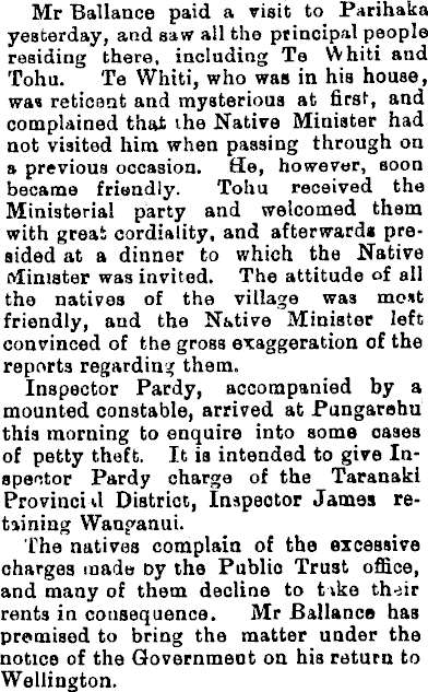 Mr Ballance paid a visit to Parihaka yesterday, and saw all the principal people residing there, including Te Whiti and Tohu. Te Whiti, who was in his house, was reticent and mysterious at first, and complained that ihe Native Minister had not visited him when passing through on a previous occasion. He, however, soon became friendly. Tohu received the Ministerial party and welcomed them with great cordiality, and afterwards presided at a dinner to which the Native Minister was invited. The attitude of all the natives of the village was most friendly, and the Native Minister left convinced of the gross exaggeration of the reports regarding them. Inspector Pardy, accompanied by a mounted constable, arrived at Pungarohu this morning to enquire into some oases of petty theft. It is intended to give Inspector Pardy charge of the Taranaki Provincial District, Inspector James retaining Wanganui. The natives complain of the excessive charges made ny the Public Trust office, and mauy of them decline to take their rents in consequence. Mr Ballance has premised to bring the matter under the notice of the Government on his return to Wellington.