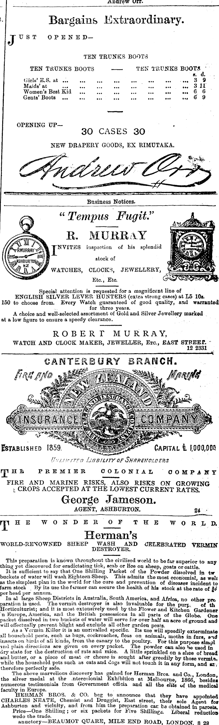 Andrew Orr. Bargains Extraordinary. UST OPENEDTEN TRUNKS BOOTS TEN TRUNKS BOOTS Girls’ E.S. at ... ... Maids’ at Women’s Best Kid Gents’ Boots TEN TRUNKS BOOTS ‘ s. d. OPENING UP--30 CASES 30 NEW DRAPERY GOODS, EX RIMDTAKA. Business Notices. IMURRAY^ SHBURTO^ “ Tempus Fugit.” R. MURRAY JNVTTES inspection of his splendid stock of WATCHES, CLOCKS, JEWELLERY, Etc., Etc. ill M Special attention is requested for a magnificent line of ENGLISH SILVER LEVER HUNTERS (extra strong cases) at L 5 10a. 150 to choose from. Every Watch guaranteed of good quality, and warranted for three yeais. A choice and well-selected assortment of Gold and Silver Jewellery marked ■„ at a low figure to ensure a speedy clearance. ROBERT MUR RAY, WATCH AND CLOCK MAKER, JEWELLER, Exo., BAST STREET. - CANTERBURY BRANCH. MtugUm mm mmm Established 1859. Capital 1 1,000,008 UnßiuTYOFShareholders IJIHSi PREMIER COLONIAL COMPANY FIRE AND MARINE RISKS, ALSO RISKS ON GROWING i CROPS ACCEPTED AT THE LOWEST CURRENT RATES. George Jameson. AGENT, ASHBURTON. 24 ■ T HE WONDER OP THE WORLD Herman’s WORLD-RENOWNED SHEEP WASH AND CELEBRATED VERMII DESTROYER. This preparation is known throughout the civilised world to be far superior to any thing yet discovered for eradictating tick, scab or Hoe on sheep, goats or cattle. It is sufficient to say that One Shilling Packet of the Powder dissolved in tw buckets of water will wash Eighteen Sheep. This admits the most economial as well as the simplest plan in the world for the cure and prevention of diseases incident to farm stock . By its nse the farmer can secure the health of his stock at the rate of Jd per head per annum. In al large Sheep Districts in Australia, South America, and Africa, no other pit. paration is used. The vermin destroyer is also Invaluable for the purf of th Horticulturist; and it is most extensively nsed by the Flower and Kitchen Gardener n Europe, America, and the British possessions in all parts of the Globe. One packet dissolved in two buckets of water will serve for over half an acre of ground and will effectually prevent blight and exclude all other garden pests. As a Vermin Killer it is an unrivalled specific. Its use will speedily exterminate all household pests, such as bugs, cockroaches, fleas on animals, moths in furs and insects on birds of all kinds, from the canary to the poultry. For this pnrpose slmpl and plain directions are given on every packet. The powder also he nsed in dry state for the destruction of rats and mice. A little sprinkled on a slice of bread and butter, or a piece of meat or cheese is sought after greedily by those vermLx, while the household pets such as cats and dogs will not touch it in any form and «ev therefore perfectly safe. * The above marvellous discovery has gained for Herman Bros, and Co., London the silver medal at the .ntercolonial Exhibition at Melbourne, 1866 besides numerous testimonials from Government officia and all the elite of the medical faculty in Europe. HERMAN BROS. & CO. bag to announce that they have appointed CHARLES NEATE, Chemist and Druggist, East street, their sole Agent for Ashburton and vicinity, and from him the preparation can be obtained in parcels. Price—One Shilling; or six packets for Five Shillings. Liberal reduotioß wedo the trade. annctory—BEAUMOT QUARE, MILE END ROAD, LONDON. 8 28