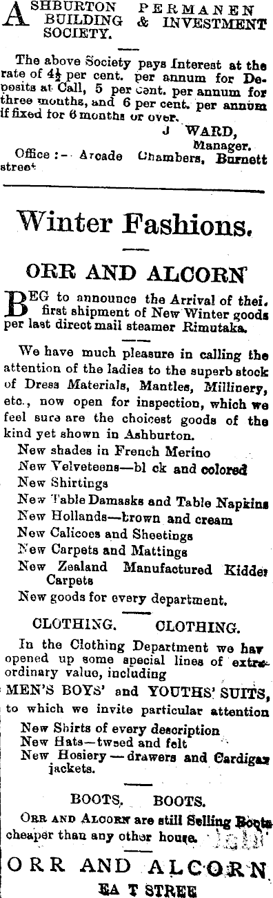 Ashburton BUILDING SOCIETY. PERMANEN & INVESTMENT The above (society pays Interest at the rate of per cent, per annum for De. posits at- Call, 5 per cent, per annum for three mouths, and 6 per cent, per annum if fixed tor 6 months or over. J WARD, Office Arcade Chambers, Barnett street Winter Fashions, ORR AND ALCORN BEG to announce the Arrival of thel. first shipment of New Winter goods per last direct mail steamer JEtimutaka, We have much pleasure in calling the attention of the ladies to the superb stock of Dress Materials, Mantles, Millinery, etc. , now open for inspection, which we feel sura are the choicest goods of the kind yet shown in Ashburton. New shades in French Merino New Velveteens—hi ck and colored New Shirtings New Table Damasks and Table Napkin* New Hollands—brown and cream New Calicoes and Sheetings New Carpets and Mattings New Zealand Manufactured Kiddei Carpets New goods for every department. CLOTHING. CLOTHING. In the Clothing Department we hay opened up some special lines of exta*. ordinary value, including MEN’S BOYS’ and YOUTHS’ SUITS, to which we invite particular attention New Shirts of every description New Hats—twsed and felt New Hosiery drawers and Cardigan jackets. BOOTS, BOOTS. Oku and Aioosir are still Selling Scot* cheaper than any other ' ORR AND ALCORN 3A I STREE