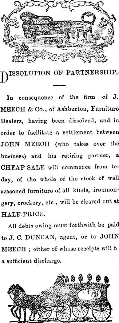 ‘<*®ss3s?sn O&a-Sfc? A i jQISSOLUTION OF PARTNERSHIP. In consequence of the firm of J. MEECH & Co., of Ashburton, Furniture Dealers, having been dissolved, and in order to facilitate a settlement between JOHN MEECH (who takes over the business) and his retiring partner, a CHEAP SALE will commence from today, of the whole of the stock of well seasoned furniture of all kinds, ironmongery, crockery, etc., will be cleared out at HALF-PRICE, All debts owing must forthwith be paid to J. C, DUNCAN, agent, or to JOHN MEECH ; either of whose receipts will b a sufficient discharge.