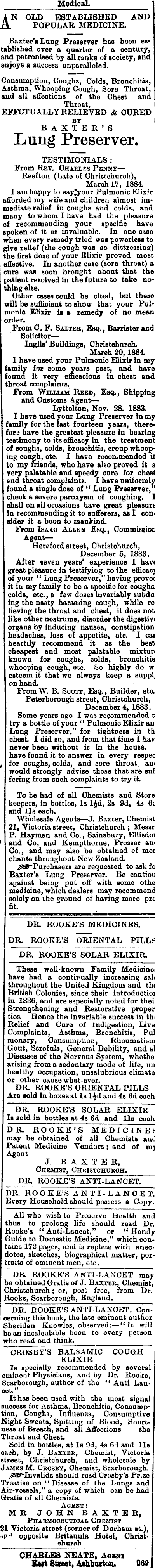 MedicaL A : N OLD ESTABLISHED AND POPULAR MEDICINE. Baxter’s Lang Preserver has been established over a quarter of a century, and patronised by all ranks of society, and enjoys a success unparalleled. Consumption, Coughs, Colds, Bronchitis, Asthma, Whooping Cough, Sore Throat, and all affections of the Chest and Throat, EFFCTUALLY RELIEVED & CURED BAXTER’S Lung Preserver. TESTIMONIALS : From Rev. Charles Penny— Reefton (Late of Christchurch), March 17, 1881 I am happy to aay'your Pulmonic Elixir afforded my wife and children almost im mediate relief in coughs and colds, and many to whom 1 have had the pleasure recommending your specific have spoken of it as invaluable. In one case when every remedy tried was powerless to give relief (the cough was so distressing) the first dose of your Elixir proved most effective. In another case (sore throat) a cure was soon brought about that the patient resolved in the future to take nothing else. Other cases could be cited, but these will be sufficient to show that your Pulmonic Elixir is a remedy of no mean order. From C. F. Salter, Esq., Barrister and Solicitor— Inglia’ Buildings, Christchurch. March 20,1881 1 have used your Pulmonic Elixir in my family for some years past, and have found it very efficacious in chest and throat complaints. From William Reed, Esq., Shipping and Customs Agent— Lyttelton, Nov. 28. 1883. I have used your Lung Preserver in my family for the last fourteen years, therefora have the greatest pleasure in bearing testimony to its efficacy in the treatment of coughs, colds, bronchitis, croup whooping cough, etc. I have recommended it to my friends, who have also proved it a very palatable and speedy cure for chest and throat complaints. 1 have uniformly found a single dose of “ Lung Preserver, ’ check a severe paroxysm of coughing. I shall on all occasions have great pleasure in recommending it to sufferers, as I consider it a boon to mankind. From Isaac Allen Esq., Commission Agent — Hereford street, Christchurch, December 5, 1883. After seven years' experience I have great pleasure in testifying to the efficacy of your “ Lung Preserver,” having proved it in my family to be a specific for coughs, colds, etc., a few doses invariably subduing the nasty harassing cough, while relieving the throat and chest, it does not, like other nostrums, disorder the digestive organs by inducing nausea, constipation, headaches, loss of appetite, etc. I can heartily recommend it as the best, cheapest and moat palatable mixture known for coughs, colds, bronchitis, whooping cough, etc. So highly do we esteem it that we always keep a supply on hand. FromW. B. Soott, Esq., Builder, etc. Peterborough street, Christchurch, December 4, 1883. Some years ago I was recommended t< try a bottle of your “ Pulmonic Elixir am Lung Preserver,” for tightness in thi chest I did so, and from that time I hav« never been without it in the house. J have found it to answer in every reaped for coughs, colds, and sore throat anc would strongly advise those that are suf. fering from such complaints to try it. To be had of all Chemists and Storekeepers, in bottles, Is l£d, 2s 9d, 4s fid and 11 s each. Wholesale Agents—J. Baxter, Chemist, 21, Victoria street, Christchurch ; Messrs P. Hayman and Co., Sainsbury, Ellisdor and Co, and Kempthorne, Prosser anc Co., and may also be obtained of met chants throughout New Zealand. are requested to ask foi Baxter’s Lung Preserver. Be caution against being pat off with some othei medicine, which dealers may recommend solely on the ground of having mote pro fit. DR. ROOKE’S MEDICINES. DR. ROOKE’S ORIENTAL PILLS, DR. ROOKE’S SOLAR ELIXIR. These well-known Family Medicines have had a continually increasing sale throughout the United Kingdom and the British Colonies, since their introduction in 1836, and are especially noted for tbeii Strengthening and Restorative properties. Hence the invariable success in the Relief and Care of Indigestion, Livei Complaints, Asthma, Bronchitis, Pulmonary, Consumption, Rheumatism. Gout, Scrofula, General Debility, and al. Diseases of the Nervous System, whethei arising from a sedentary mode of life, unhealthy occupation, unsalubrioua climate, or other cause what-ever. DR. ROOKE’S ORIENTAL PILLS Are sold In boxes at Is l£d and 4s fid each, DR. ROOKE’S SOLAR ELIXIR Is sold in bottles at 4s fid and 11s each. DR. ROOKE’S MEDICINES may be obtained of all Chemists and Patent Medicine Vendors; and of my Agent J BAXTER, Chemist, Christchurch. DR. RQOKE’S ANTI-LANCET. DR. ROOKE’S ANTI-LANOET. Every Household should possess a Copy. All who wish to Preserve Health and thus to prolong life should read Dr. Rooke’s “ Anti-Lancet,” or “ Handy Guide to Domestic Medicine,” which contains 172 pages, and is replete with anecdotes, sketches, biographical matter, portraits of eminent men, etc. DR. ROOKE’S ANTI-LANOET may be obtained Gratis of J. Baxter, Chemist, Christchurch; or, poa'j free, from Dr. Rooks, Scarborough, England. DR. ROOKE’S ANTI-LANOET. Concerning this book, the late eminent author Sheridan Knowles, observed;—“lt will be an incalculable boon to every person who read and think. CROSBY’S BALSAMK) COUGH ELIXIR Is specially recommended by several eminent Physicians, and by Dr. Rooke, Scarborough, author of tho ‘ ‘ Anti Lancet. ” It has been used with the moat signal success for Asthma, Bronchitis, Consumption, Coughs, Influenza, Consumptive Night Sweats, Spitting of Blood, Shortness of Breath, and all Affections the Throat and Chest. Sold in bottles, at Is 9d, 4s fid and 11a each, by J. Baxter, Chemist, Victoria street, Christchurch, and wholesale by James M. Crosby, Chemist, Scarborough. should read Crosby’s Pr.ze Treatise on “Disease of the 1.-ungs and Air-vessels,” a copy of which can be had Gratis of all Chemists. i Agent: MR JOHN BAXTER, Pharmooeutioal Chemist 21 Victoria street (corner of Durham at.), -<p-* opposite Britan