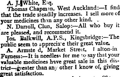 A. J.|White, E;q. Thomas Chapmm. West J that the trade steadily increa your medicines thin any oth< N. Danoll, Clun, Salop are pleased, and recommend Jos. Balkwill, A.P.S., K public see
