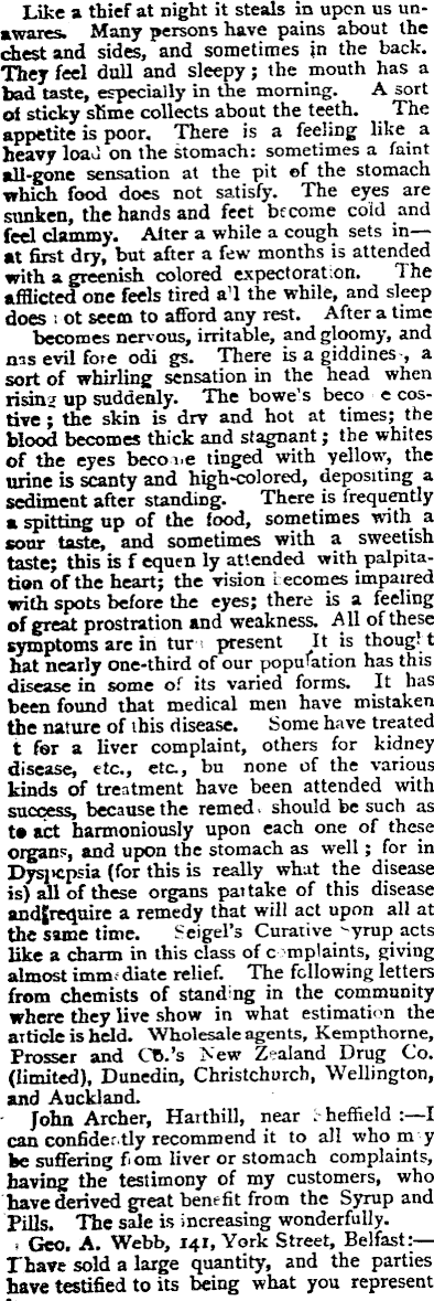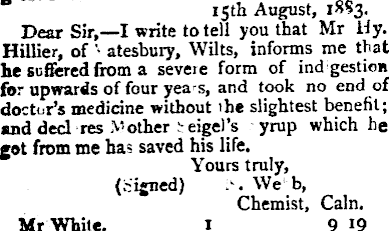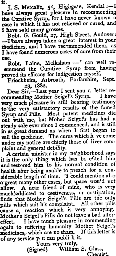 It. J. S. Metcalfe, 5?, Highg have always great pleasure the Curative Syrup, for I hav rnKf in which it has not relie' I have sold many grosses. »obt G. Gould, 27, High always taken a grea medicines, and I have rec'im I have found numerous cases use. Robt Laine, Melksham ; emmend the Curative Syi proved its efficacy for indiges Friockbeim, Arbroath, F 23, 1882. Dear Sir, —Last year I seni commending Mother Seigel’s very much pleasure in still b to the very satistactory resd Syrup and Pills. Most pate out with me, but Moher S« steady sale ever since I comm in as great demand as when sell the ipedicine. The cures under my notice are chiefly th plaint and general debility. A certain minister in my n it is the only thing which hi