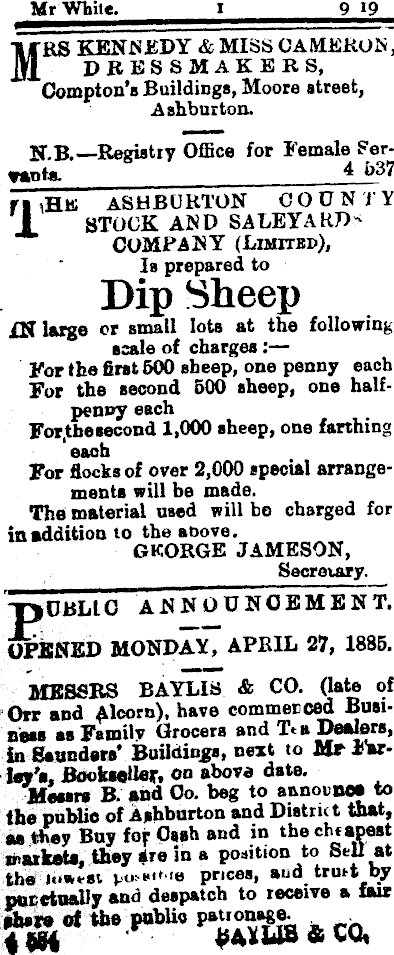 Mr White. 9 19 M RS KENNEDY & MISS CAMERON, DRESSMAKERS, Compton’s Buildings, Moore street, Ashburton. N.B.—Registry Office for Female Servants. 4 b 37 f | iHE ASJHBO ETON COUNTY I STOCK AND SA LEYA HDCOMPANY (Limited), Is prepared to Dip Sheep large or small lots at the following scale of charges:— For the first 500 sheep, one penny each For the second 500 sheep, one halfpenny each For.tbesecond 1,000 sheep, one farthing each For flocks of over 2,000 special arrangements will be made. The material used will bo charged for in addition to the above. GKORGE JAMESON, Secretary. "fjUBLLO ANNOUNCEMENT. OPENED MONDAY, APRIL 27, 1885. MESSRS BAYLIS & CO. (late of Gtr and Alcorn), have commenced BustBaca as Family Grocers and T* a Dealers, In Saunders’ Buildings, next to Mr Parley's, Bookseller, oo above date. Messrs B. and 00. beg to announce to the public of Ashburton and District that, as they Buy fof Ossb and in the cheapest markets, they are in a position to Sell at the lowest. Vo- pfeos, aud trust by punctually and despatch to receive a fair shave of the public patronage. ■ 4 994 ■ SA*U» ®w» I