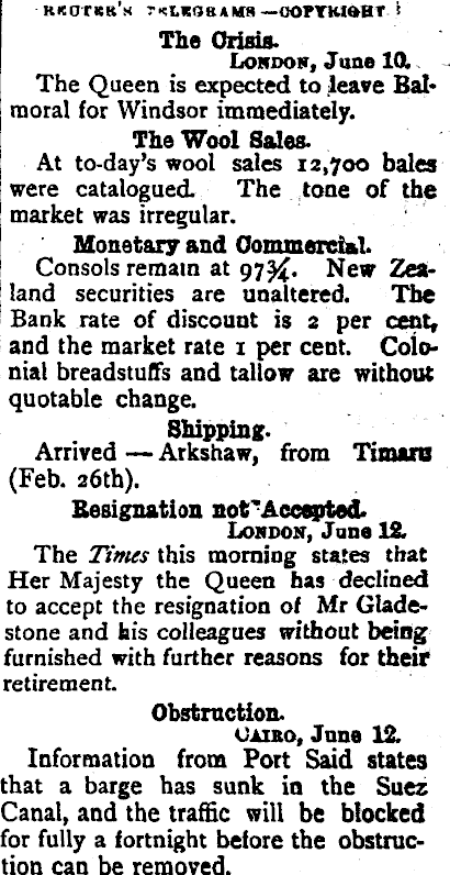 KKOTKR’m ncLKSBAMS — OOPTHIftHT » The Crisis. Loudon, Jane 10. , The Queen is expected to leave Balmoral for Windsor immediately. The Wool SalesAt to-day’s wool sales 12,700 bales were catalogued. The tone of the market was irregular. Monetary and Commercial. Consols remain at New Zealand securities are unaltered. The Bank rate of discount is 2 per cent, and the market rate 1 per cent. Colonial breadstuff's and tallow are without quotable change. Shipping. Arrived Arkshaw, from Timara (Feb. 26th). Resignation not'Accepted. Loudon, June 12. The Times this morning states that Her Majesty the Queen has declined to accept the resignation of Mr Gladestone and fais colleagues without being furnished with further reasons for their retirement. Obstruction. Cairo, Jnne 12. Information from Port Said states that a barge has sunk in the Sues Canal, and the traffic will be blocked for fully a fortnight before the obstruction can be removed.